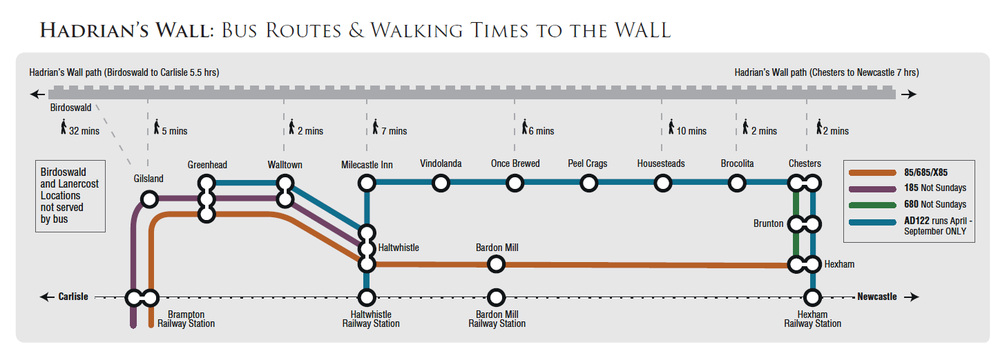 Good regular bus services also connect to both Hebden Bridge and Bardon Mill. The Hadrian's Wall Bus runs throughout the summer between Haltwhsitle, Greenhead and Hexham.